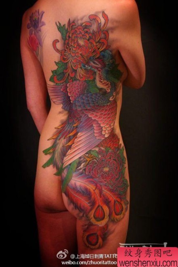 女生背部侧腰到臀部好看的彩色凤凰纹身图案