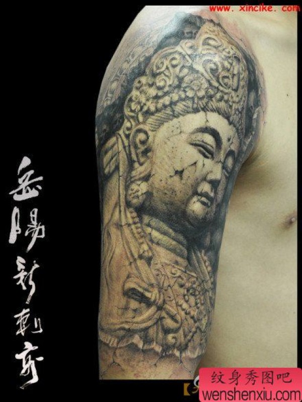 手臂经典的石雕大势至菩萨纹身图案