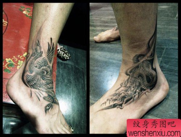 脚部经典的情侣龙与凤凰纹身图案