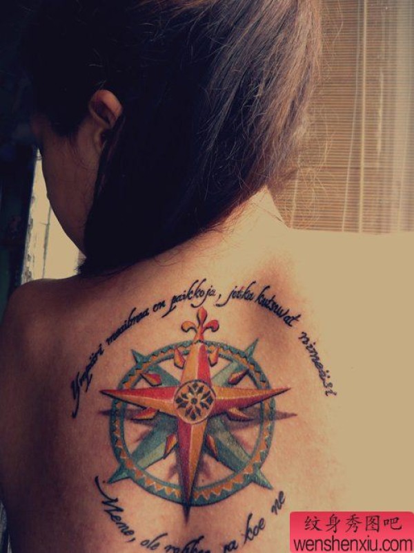 女生背部漂亮的指南针与字母纹身图案