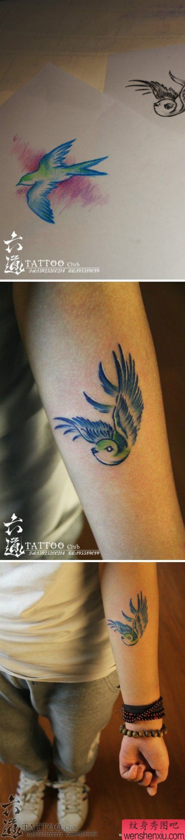 女生手臂彩色小燕子纹身图案