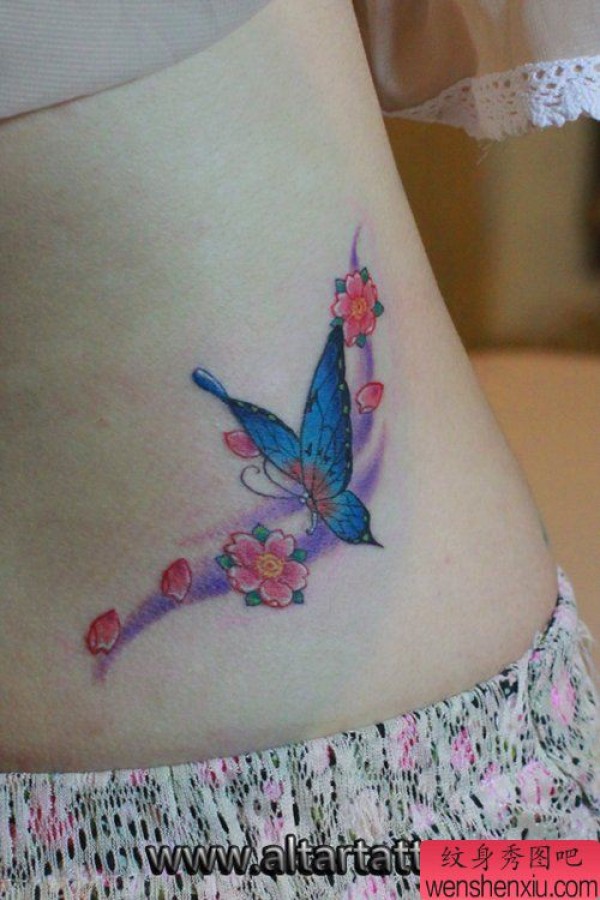 女生腰部漂亮好看的蝴蝶樱花纹身图案