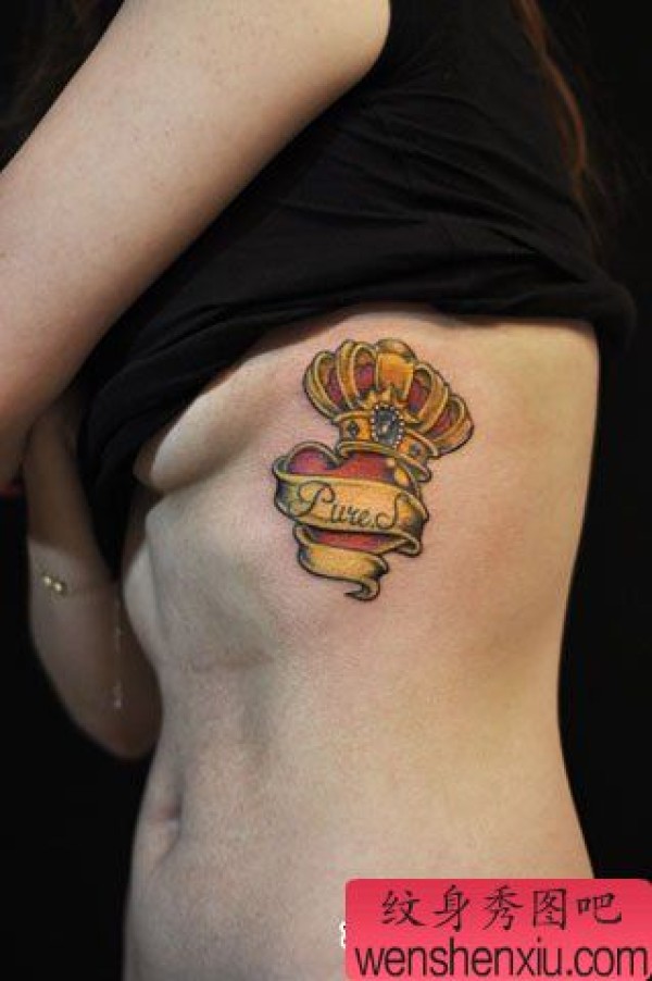 美女侧胸彩色皇冠与爱心纹身图案