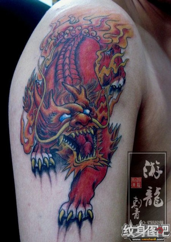 肩膀上的火焰麒麟纹身图