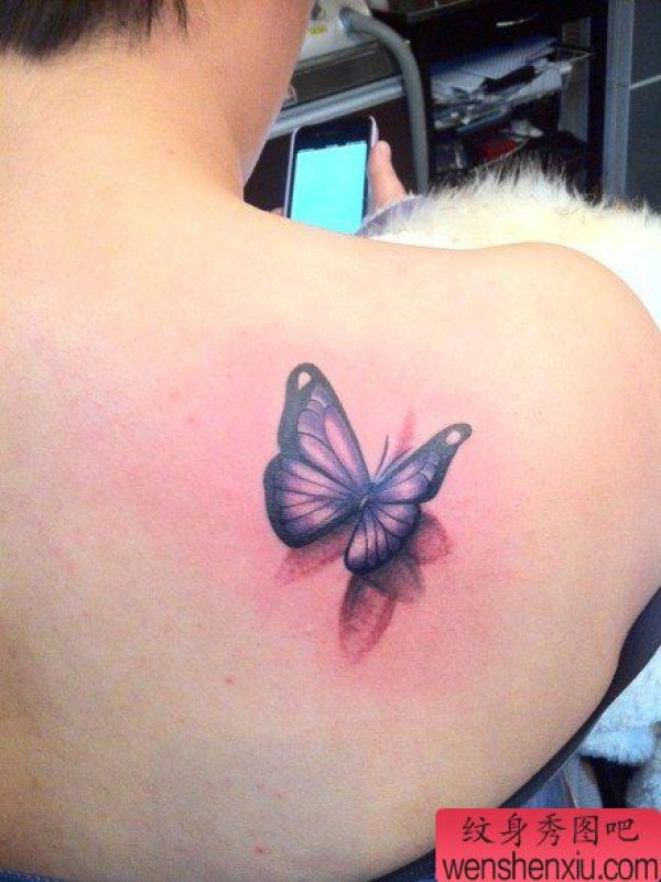 女生背部唯美好看的彩色蝴蝶纹身图案