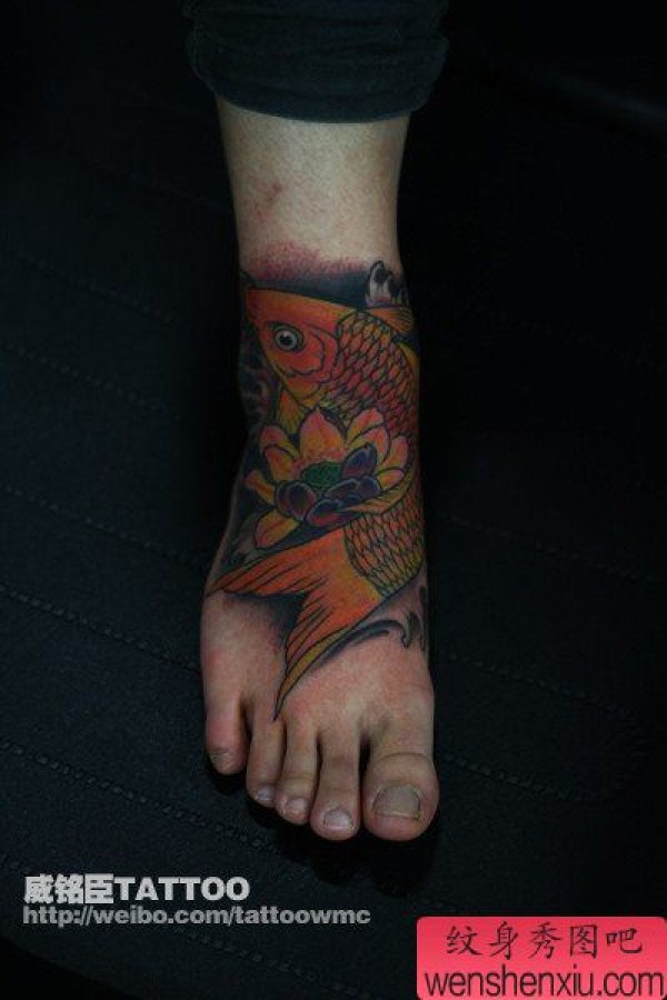 女生脚部好看的彩色鲤鱼莲花纹身图案