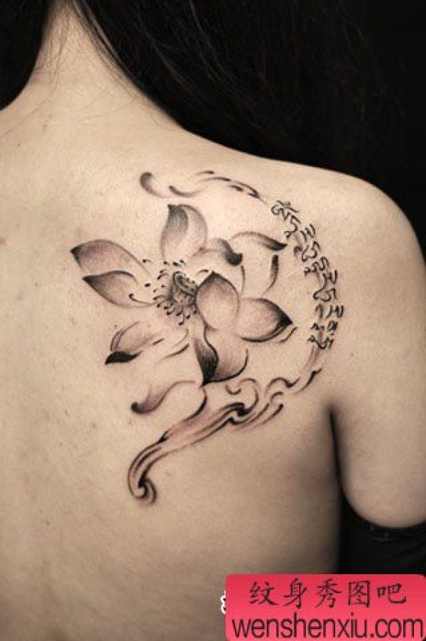 女生背部唯美写意的水墨莲花纹身图案