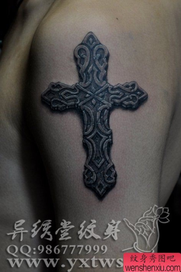 男士手臂一张经典的石雕十字架纹身图案