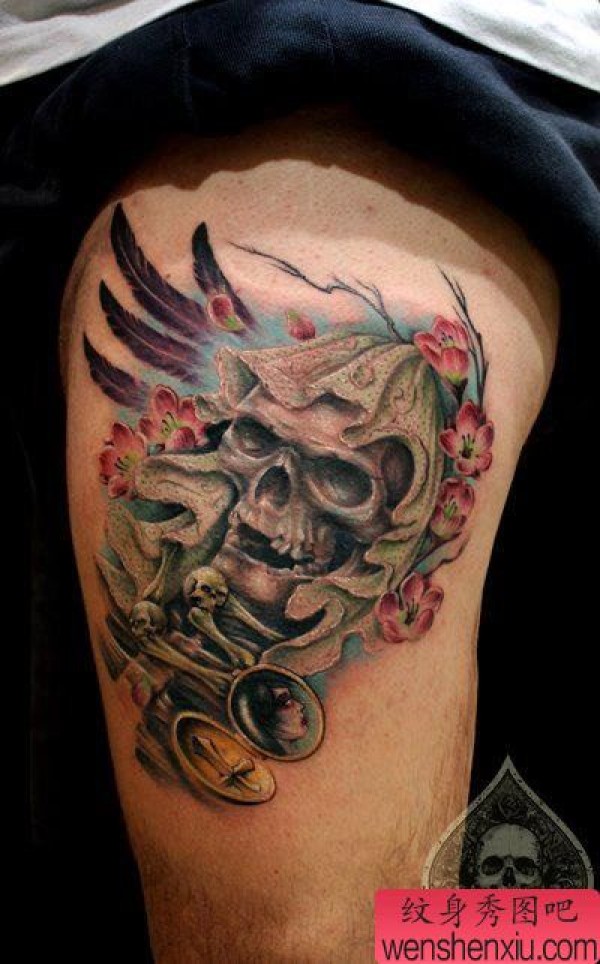 一张腿部超酷的欧美彩色骷髅纹身图案