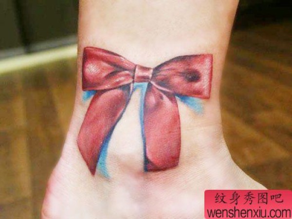女生脚踝处漂亮的彩色蝴蝶结纹身图案