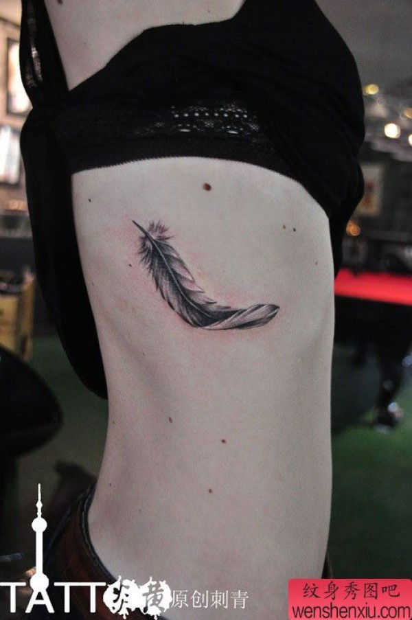 美女侧胸时尚精美的羽毛纹身图案