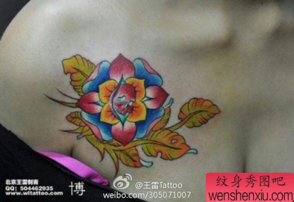 美女胸部时尚漂亮的彩色花卉纹身图案