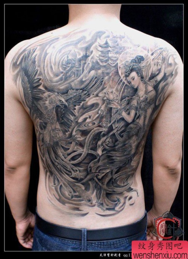 男士满背经典的飞天敦煌与朱雀纹身图案