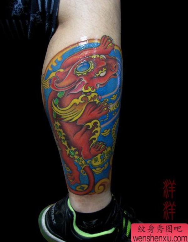 腿部好看漂亮的彩色招财神兽貔貅纹身图案