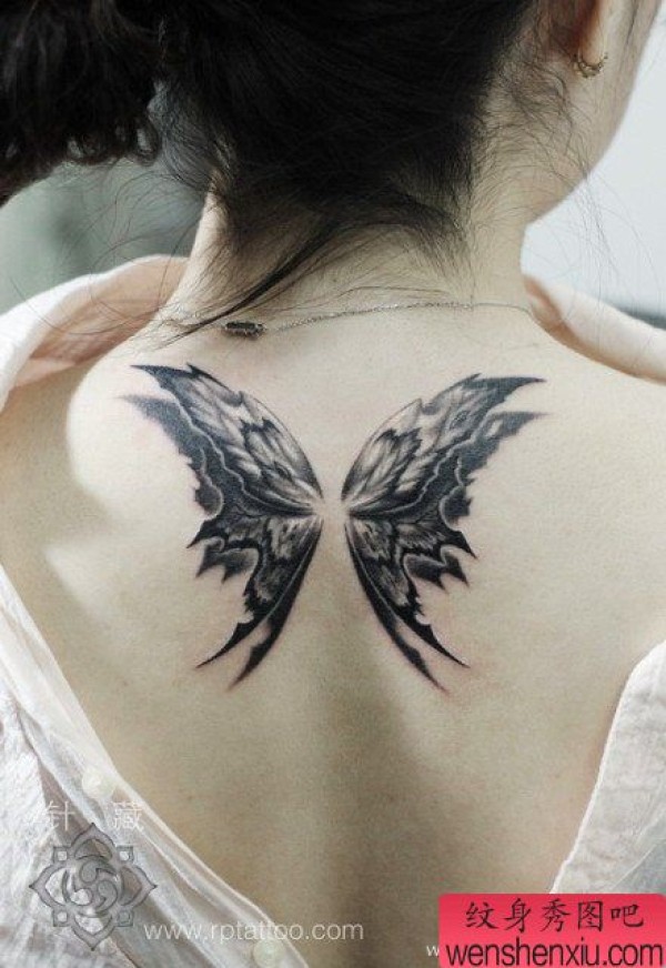 女生背部时尚精美的蝴蝶翅膀纹身图案