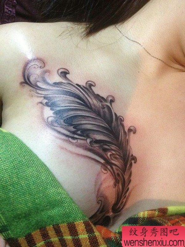 美女胸部精美时尚的羽毛纹身图案