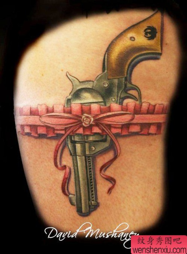 女生腿部精美时尚的蕾丝手枪纹身图案