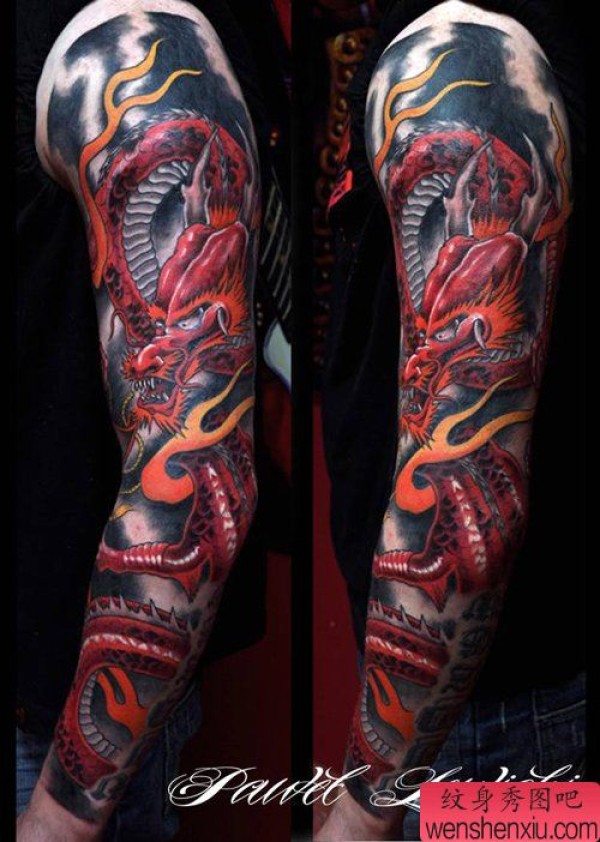 男士手臂时尚经典的花臂龙纹身图案