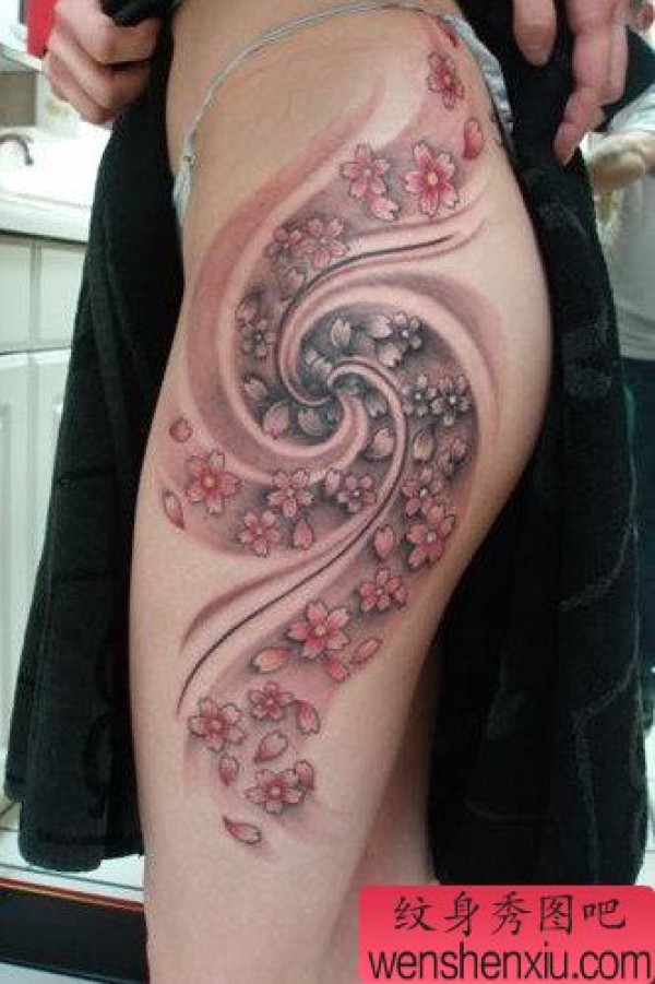 美女臀部时尚精美的樱花纹身图案