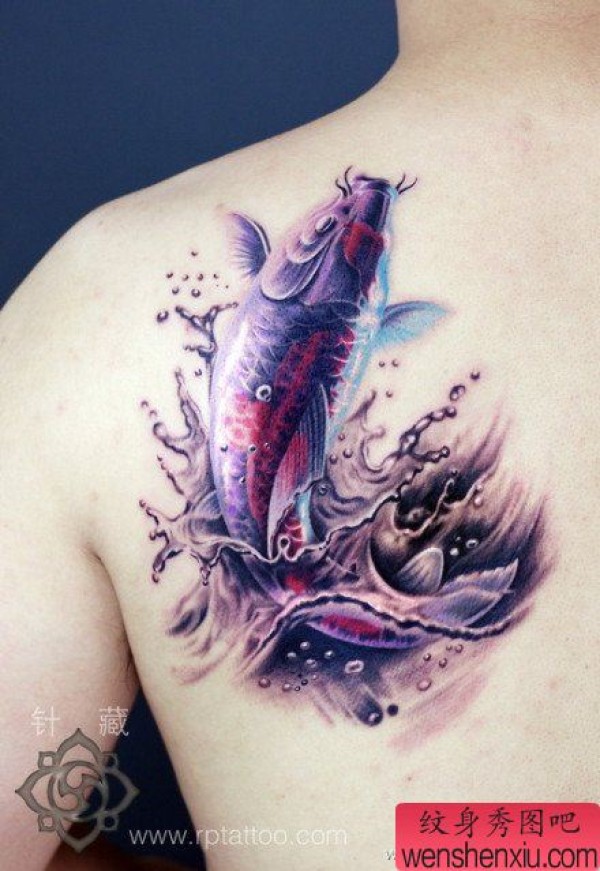 男士肩背时尚精美写实的彩色鲤鱼纹身图案