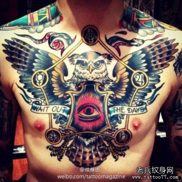 男士胸前霸气超酷的猫头鹰纹身图案