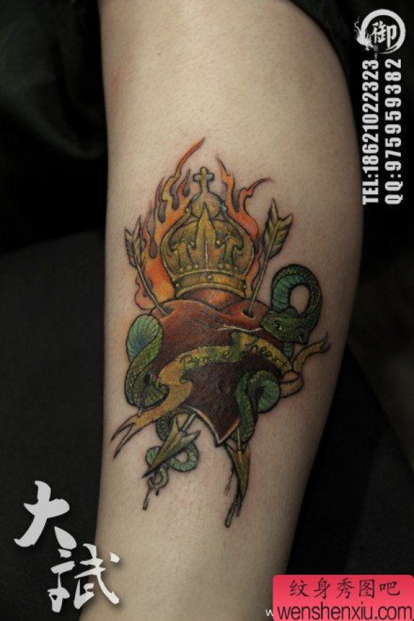 美女腿部时尚精美的爱心皇冠与蛇纹身图案