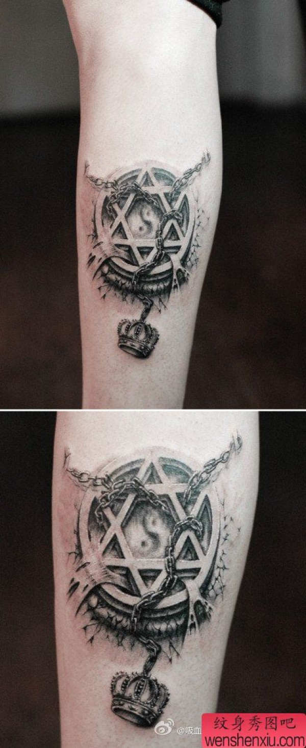 腿部时尚经典的六芒星与皇冠吊链纹身图案
