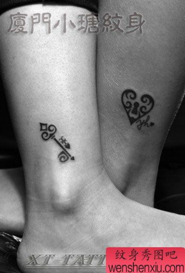 腿部时尚时尚的情侣钥匙与爱心锁纹身图案