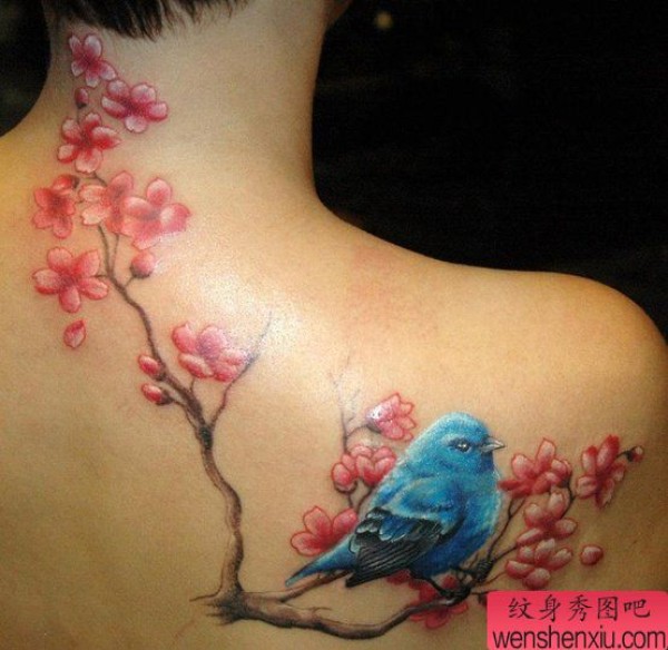 美女背部漂亮精美的彩色喜鹊梅花纹身图案