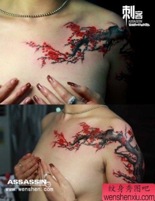 美女手臂到胸部漂亮时尚的梅花纹身图案