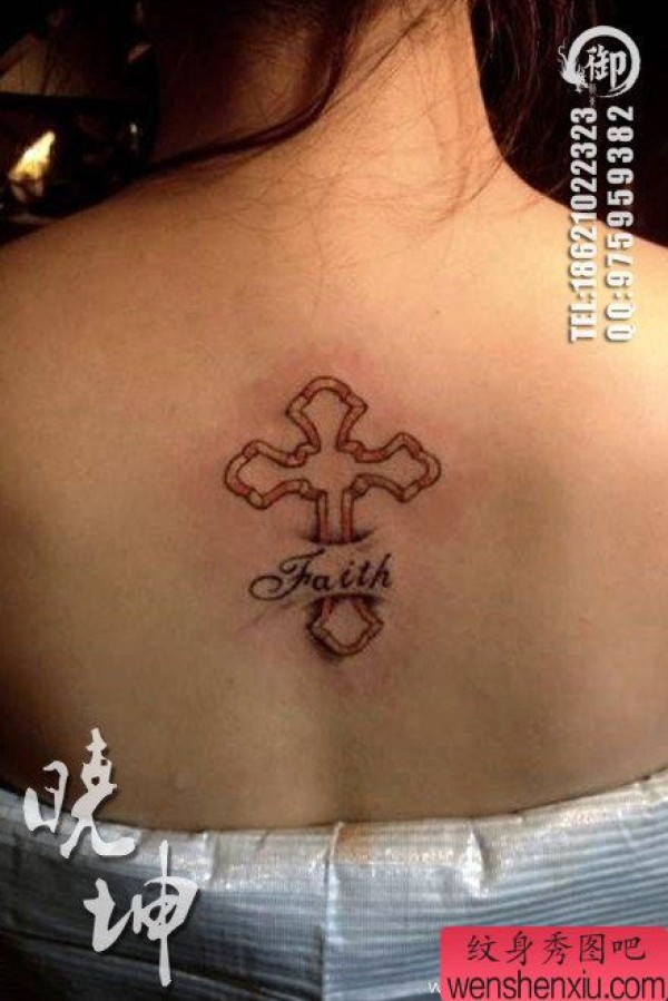女生背部简单唯美的十字架纹身图案