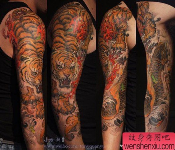 男士手臂帅气时尚的下山虎与鲤鱼纹身图案