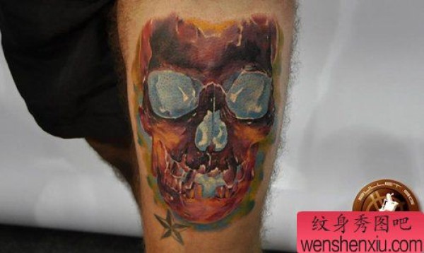 腿部经典帅气的欧美彩色骷髅纹身图案