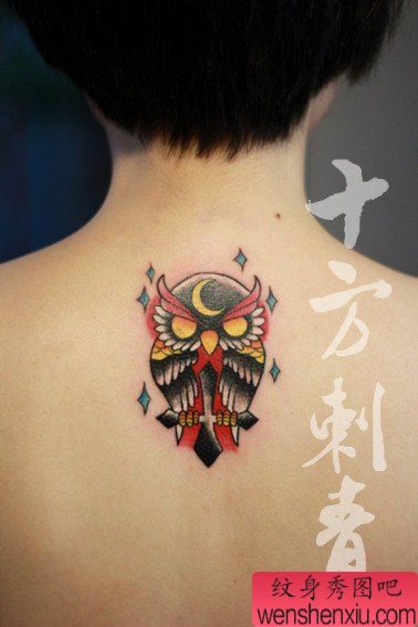 女生背部时尚可爱的猫头鹰纹身图案