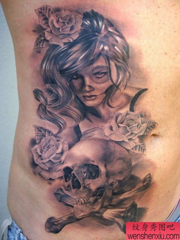 男士腹部经典帅气的黑灰骷髅纹身图案