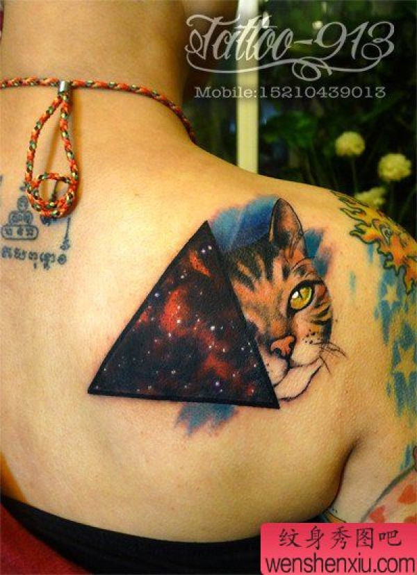 女生背部时尚经典的星空与猫咪纹身图案