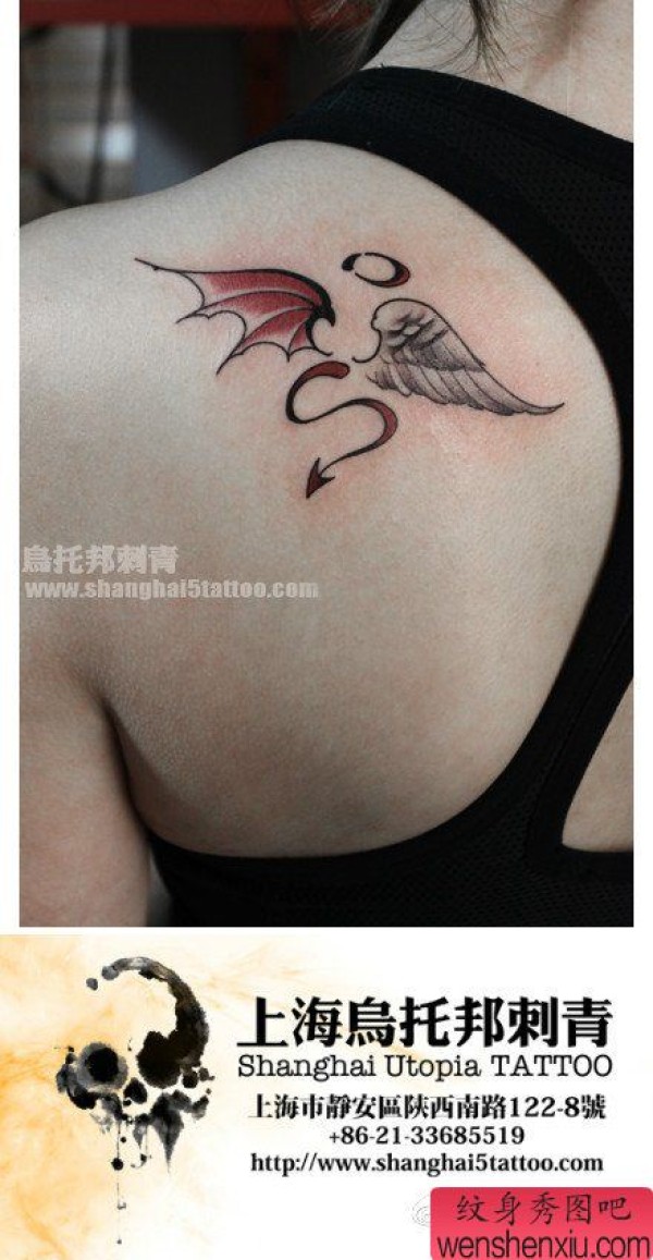 女生肩背时尚时尚的天使与恶魔的翅膀纹身图案