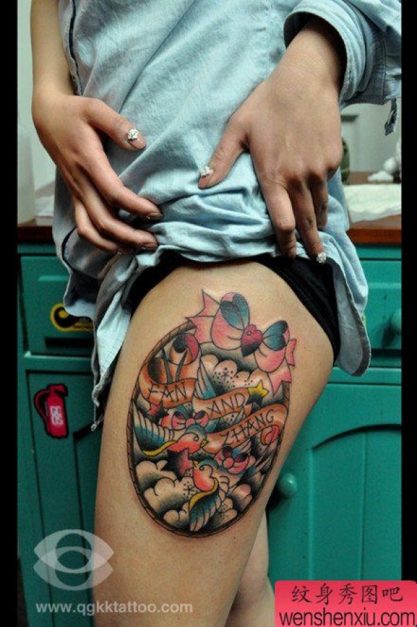 女生腿部时尚精美的小燕子与蝴蝶结纹身图案