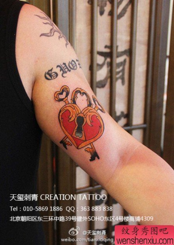 男士手臂内侧时尚时尚的爱心锁纹身图案