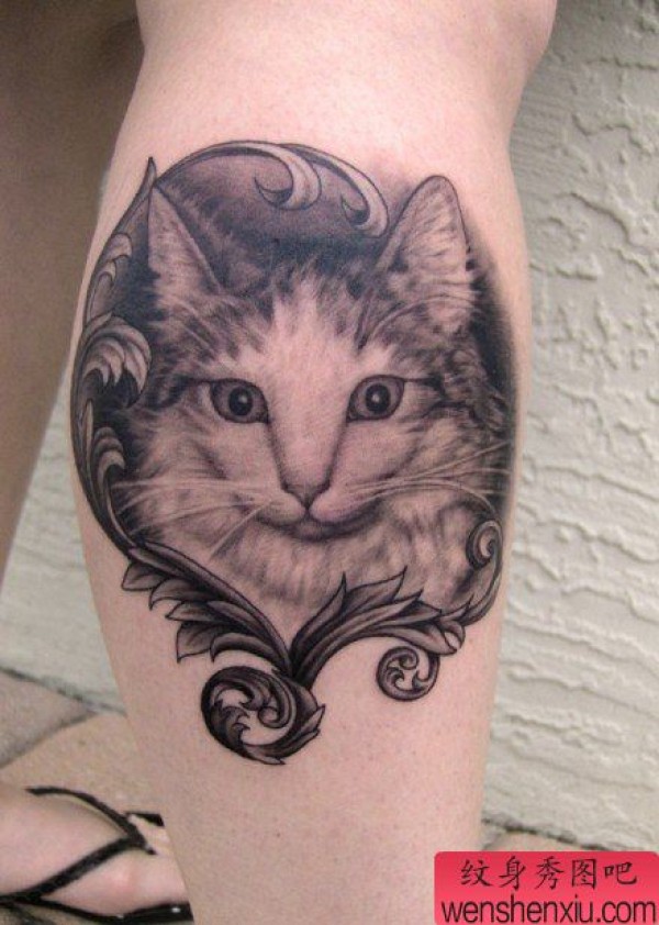一张腿部呆呆的猫咪纹身图案