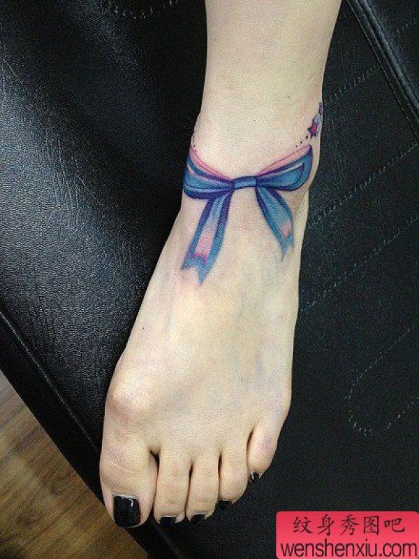 女生脚部漂亮时尚的彩色蝴蝶结纹身图案