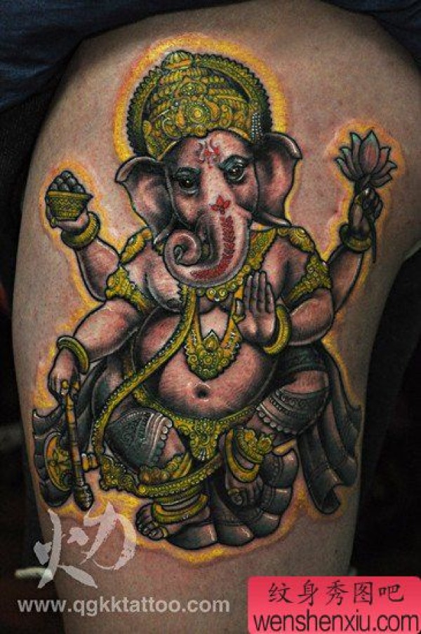 腿部时尚经典的象神纹身图案