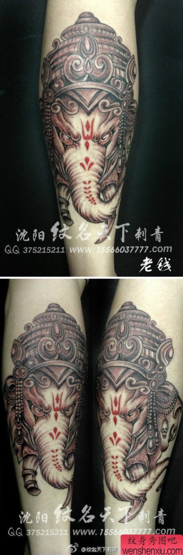 腿部经典凶悍的象神纹身图案