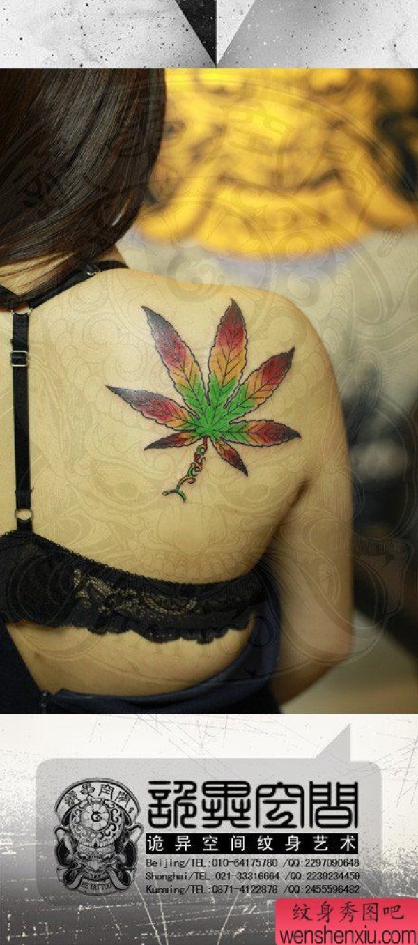 女生背部漂亮精美的叶子纹身图案