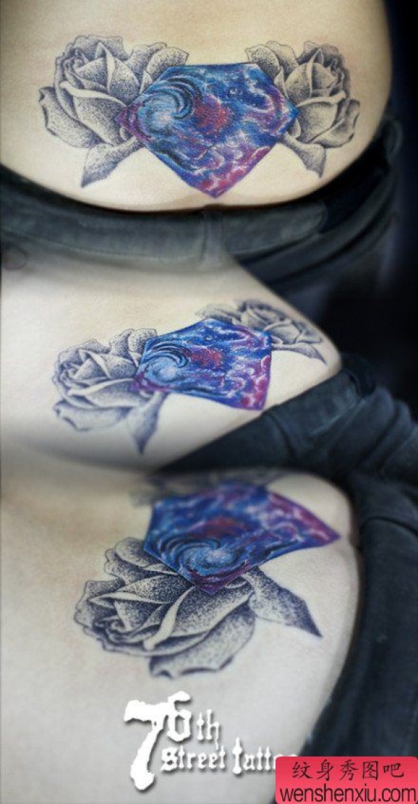 美女腰部时尚经典的星空钻石玫瑰花纹身图案