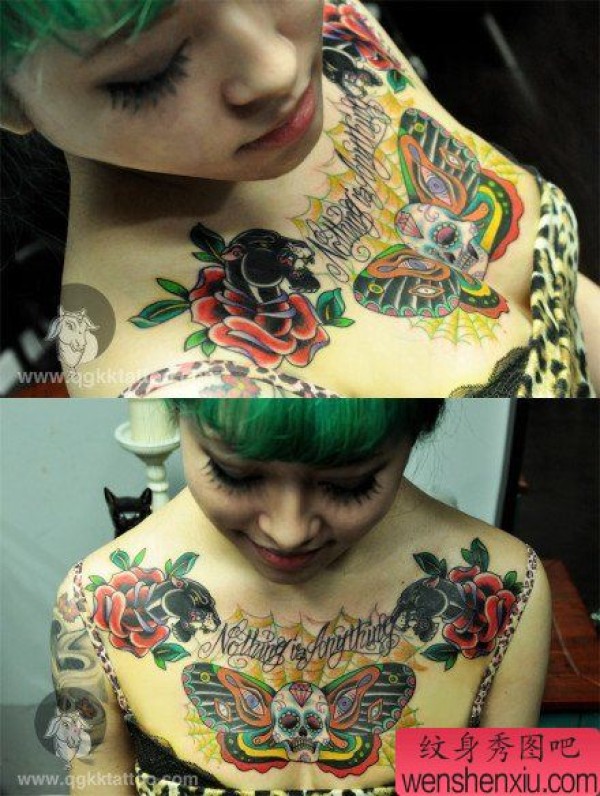 美女前胸时尚精美的骷髅蝴蝶纹身图案