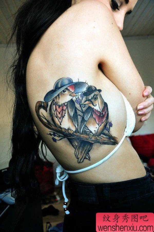 女生侧腰时尚经典的小鸟纹身图案