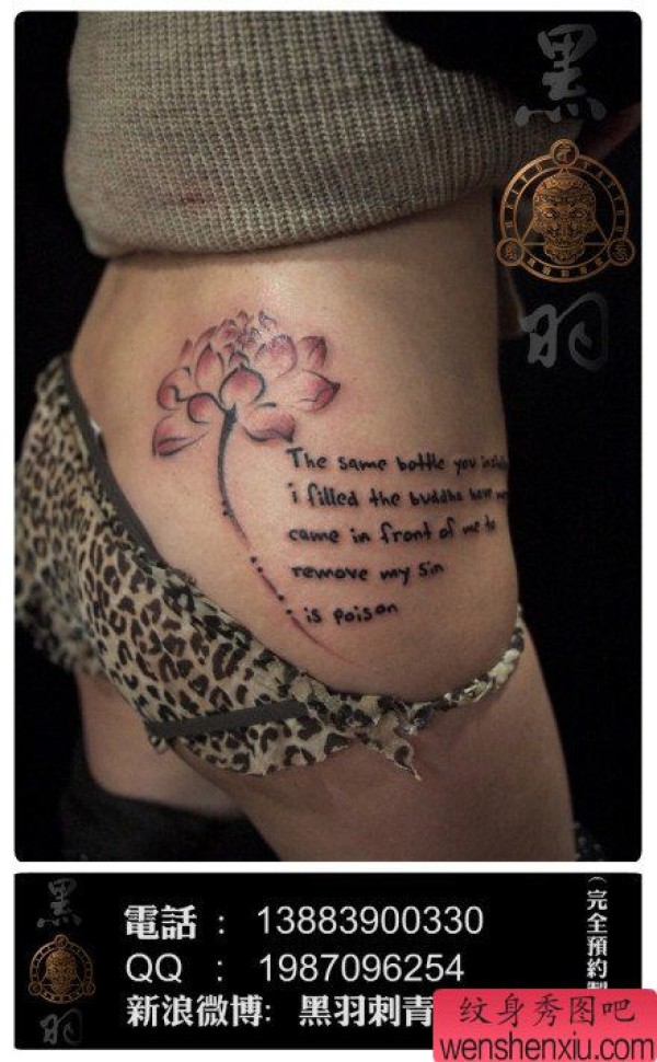 美女腰部时尚漂亮的水墨莲花与字母纹身图案