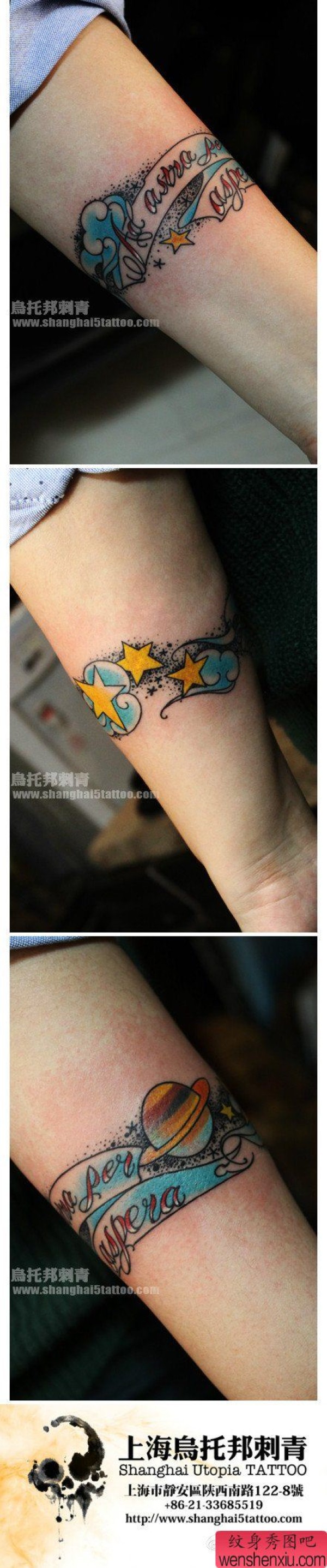 女生手臂时尚精美的字母与星星月亮纹身图案