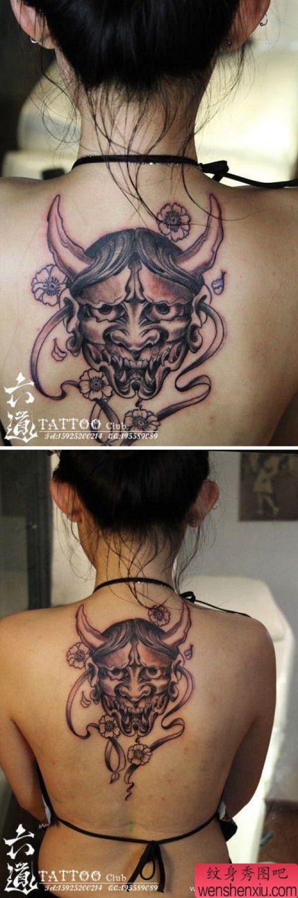 美女背部时尚经典的黑灰般若纹身图案